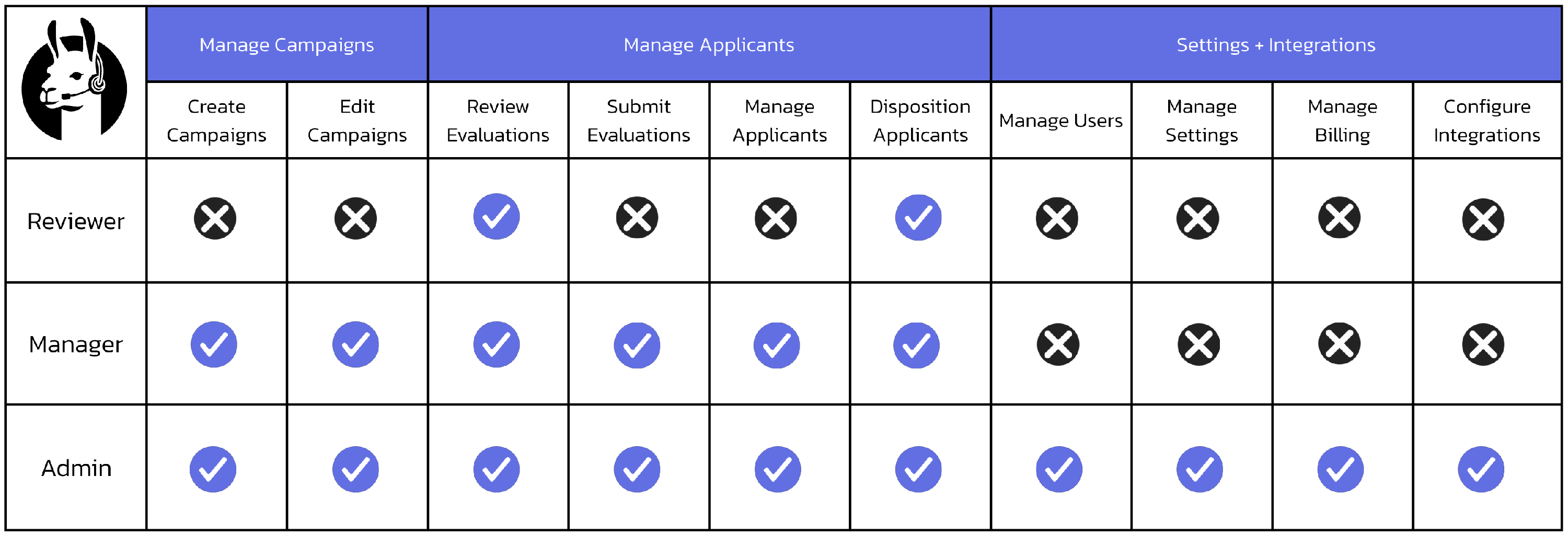 Admins hold complete control over the Talent Llama platform. They manage user permissions, configure integrations like ATS or Slack, adjust company settings, and oversee billing and subscriptions. Admins also have full visibility and editing rights across all campaigns, applicants, and evaluations. They’re responsible for ensuring everything runs smoothly, from technical connections to overall system governance.