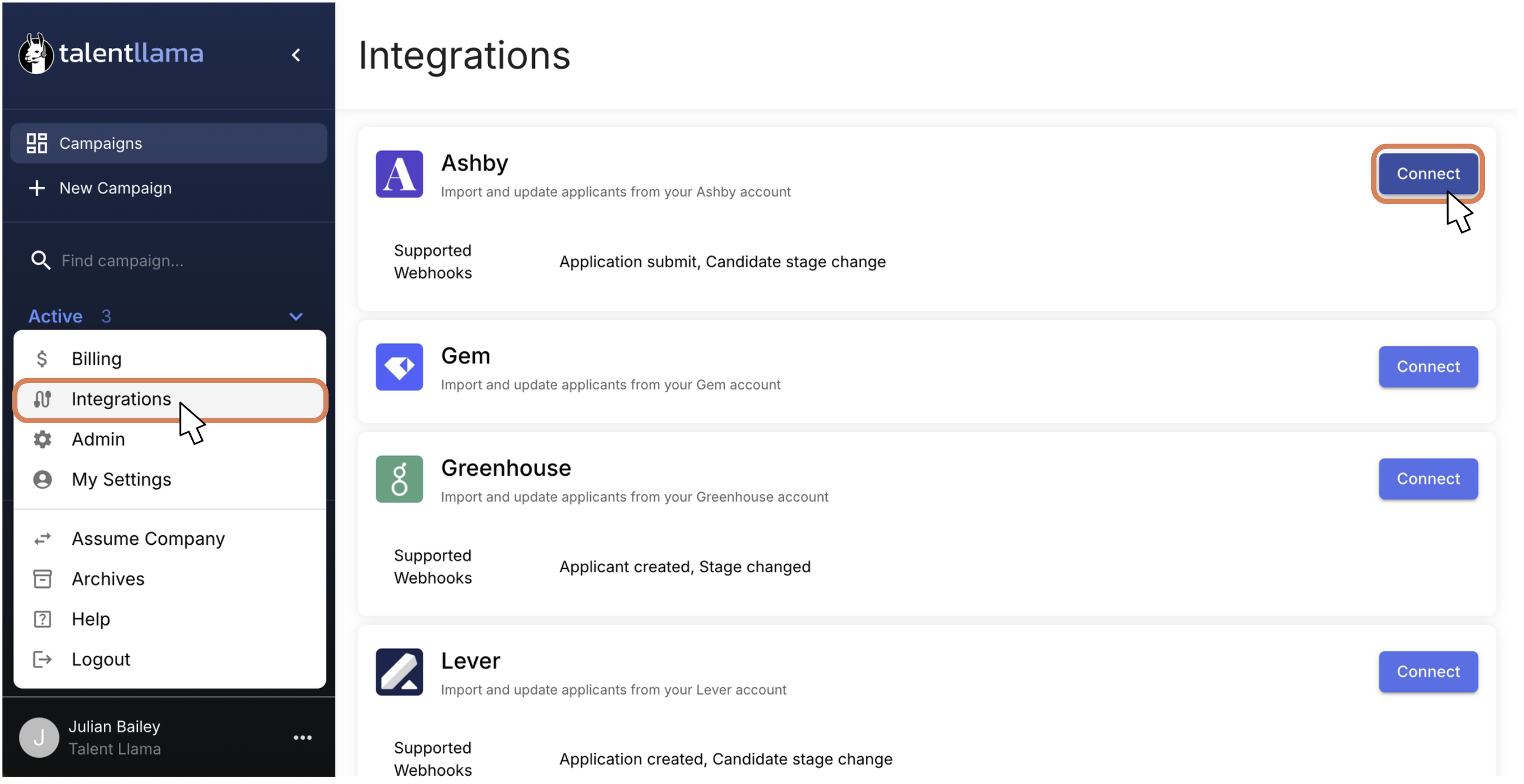 Step 1: In the bottom-left corner, click the three dots ( ⋯ ), select Integrations, then click Connect next to Ashby to start the integration.