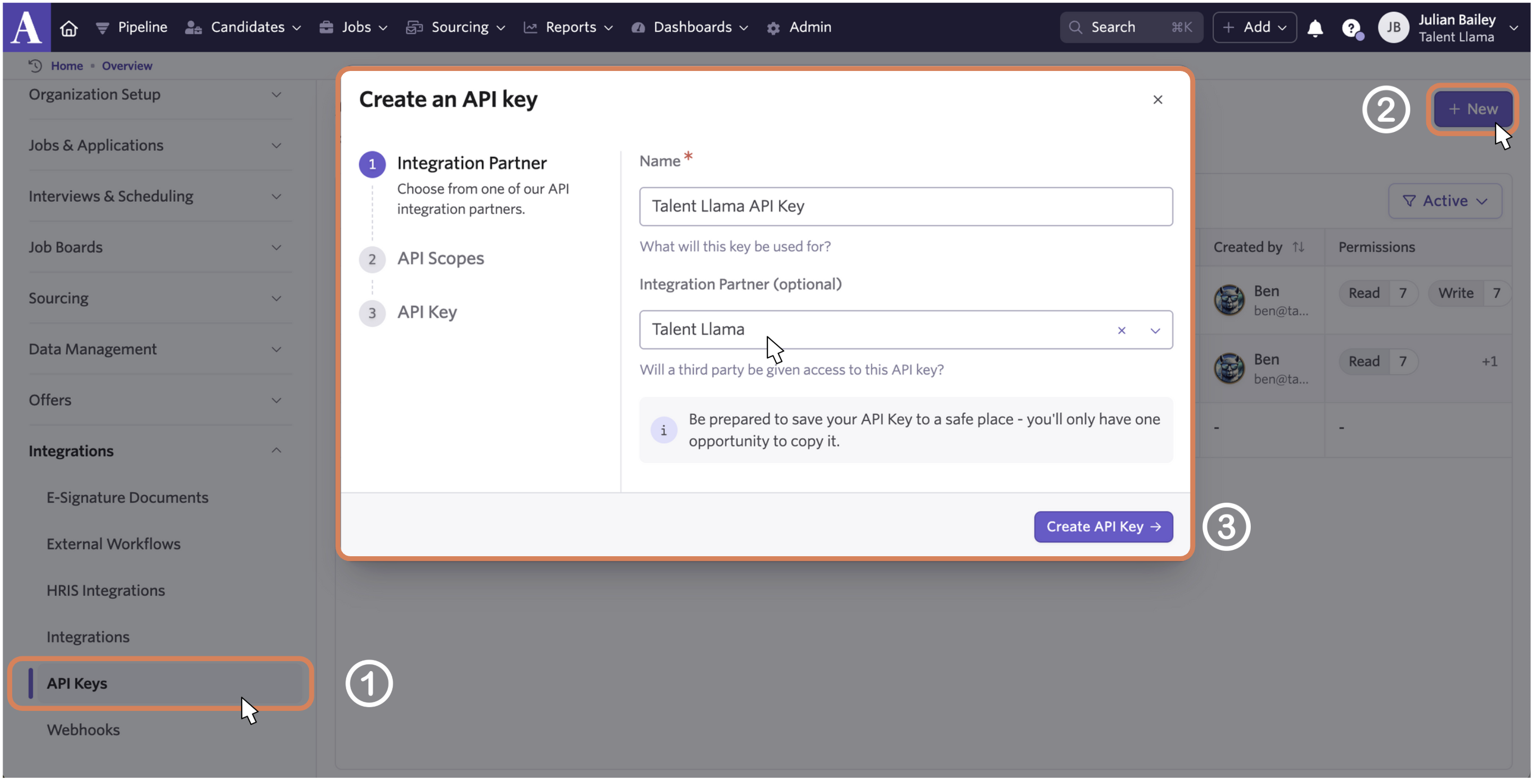 To connect Talent Llama with Ashby, you’ll need to create an Ashby API Key.