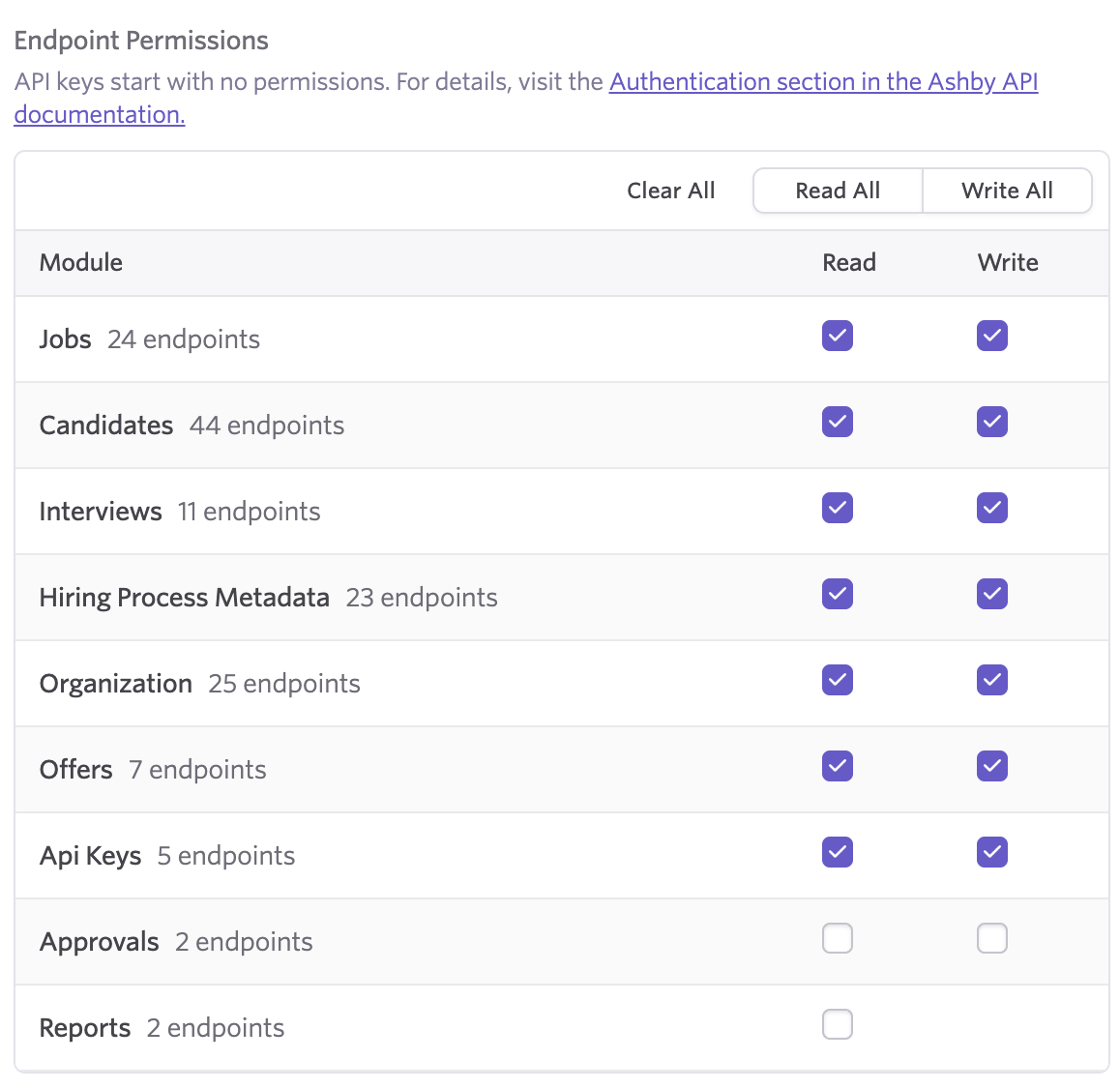 You shouldn't need to select which API Scopes are being used in the API, as we're built that into the integration for you, however, for your reference, we've preselected all API Scopes except for Approvals and Reports. (This is so you can trigger the Talent Llama process from any module in Ashby).