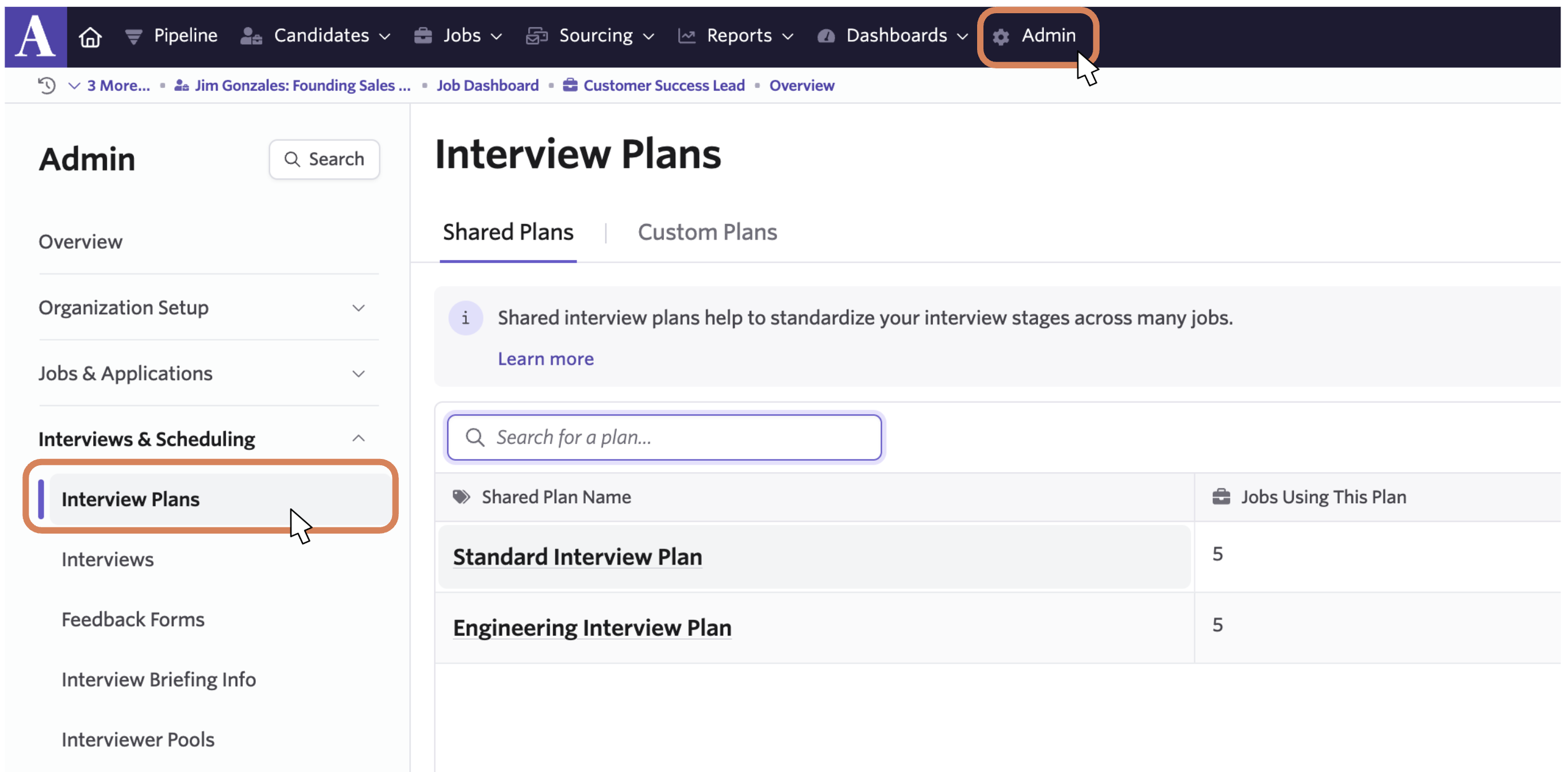 In Admin > Interviews & Scheduling within Ashby, you'll see Interview Plans on the left side. In here, you can set up which Application Stage will send Applicants to Talent Llama.