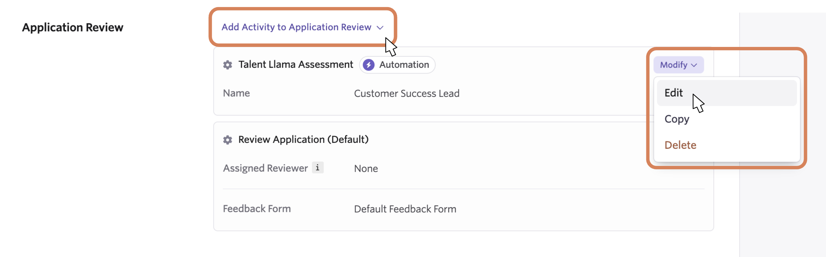 To add this, find the Interview Plan > Stage you want to enable the Talent Llama screening on (Application Review for example). Then click Add Activity to [Your Stage Choice] and select Talent Llama Assessment.