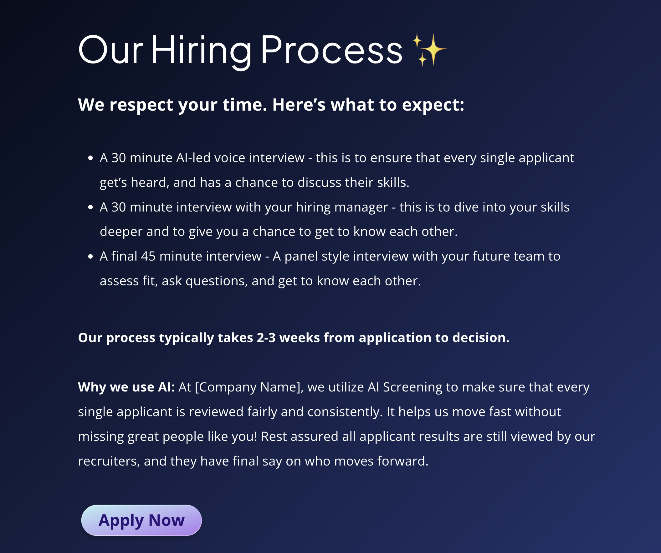 AI screening isn’t a filter. It’s a fairness tool. The right framing turns what could feel cold into something empowering. That's why it's important to mention AI early.