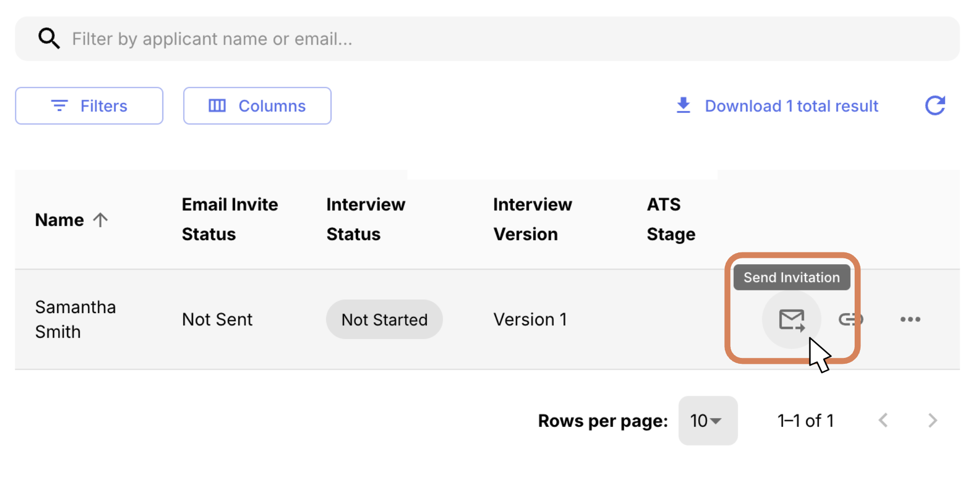 Step 3: You will then see your test candidate name appear. When you're ready to test, click Send Invitation. This will send out the invitation to your email so you can see what the candidate receives.