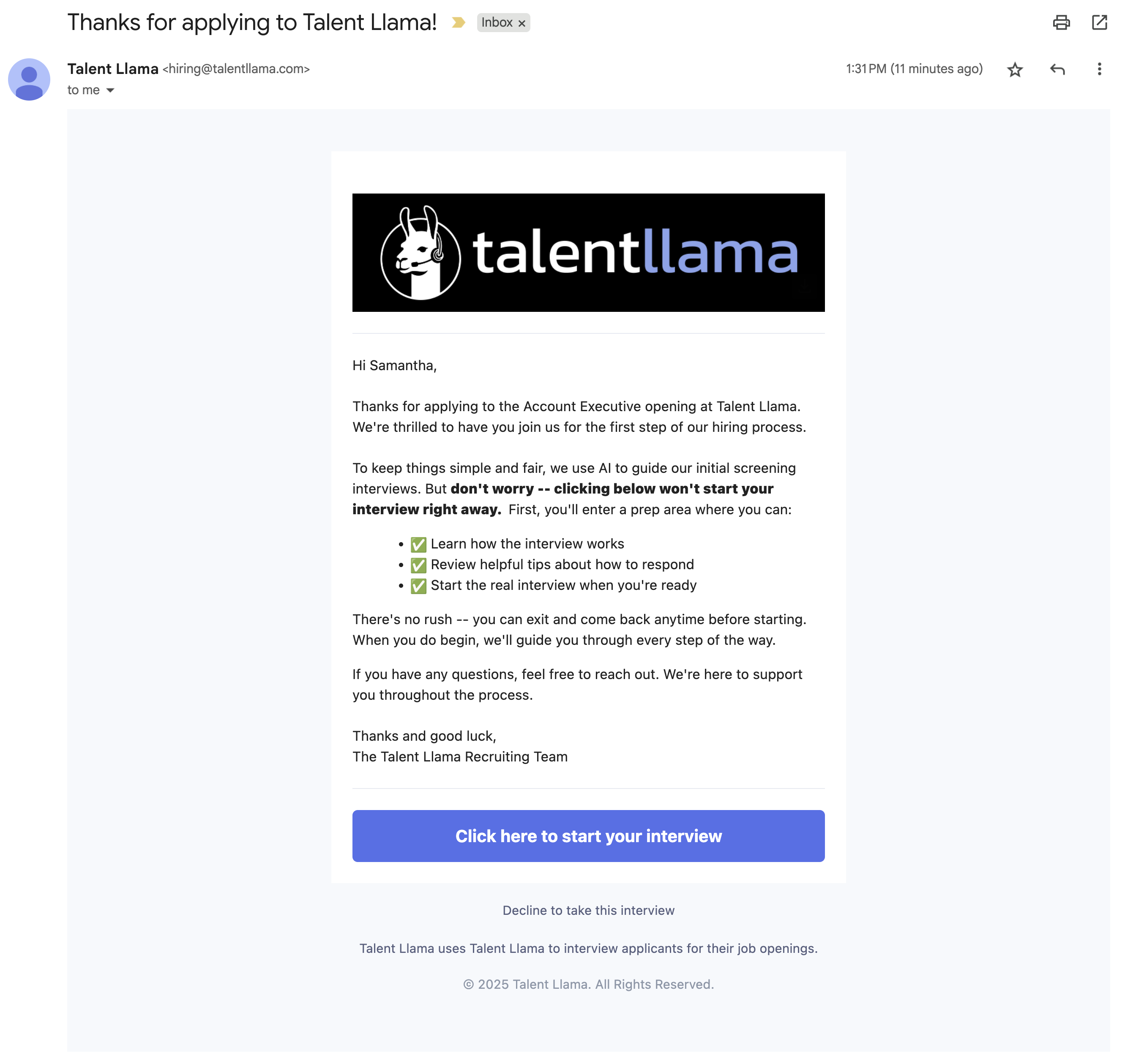 There are a few ways to do this, but for this example - we want to test it almost end-to-end. You won't have to complete the full interview (you can if you want!), but we'd recommend at least sending yourself the email, opening, and starting the process, just to get a feel for what your candidates will experience.