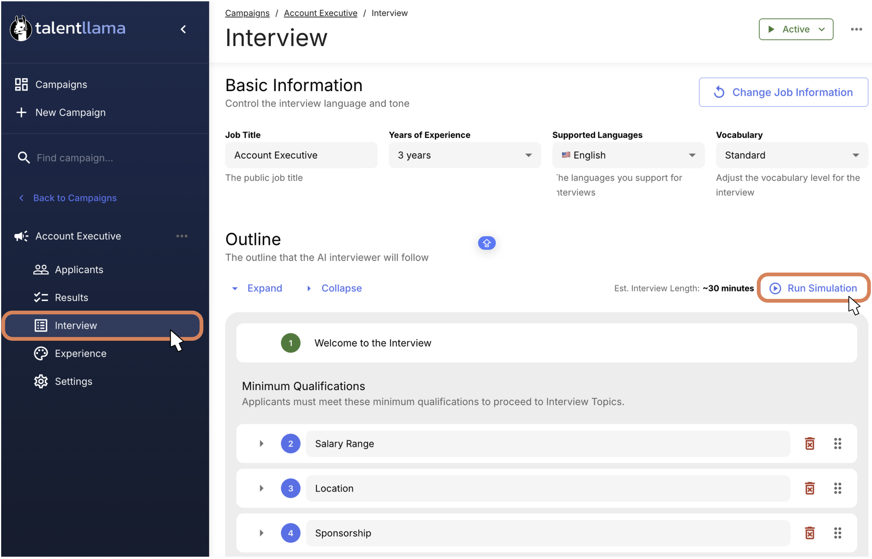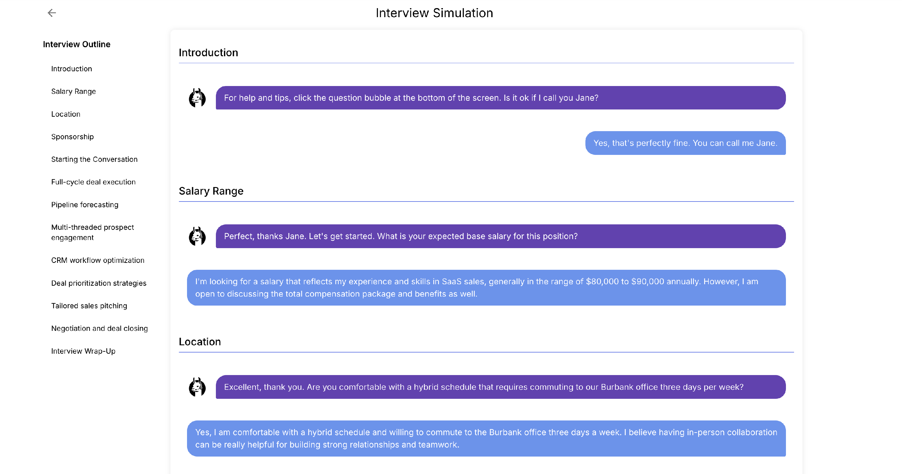 From there, Talent Llama will generate a full interview transcript to show you what it would flow like based on your Outline, allowing you to get a feel for the flow.