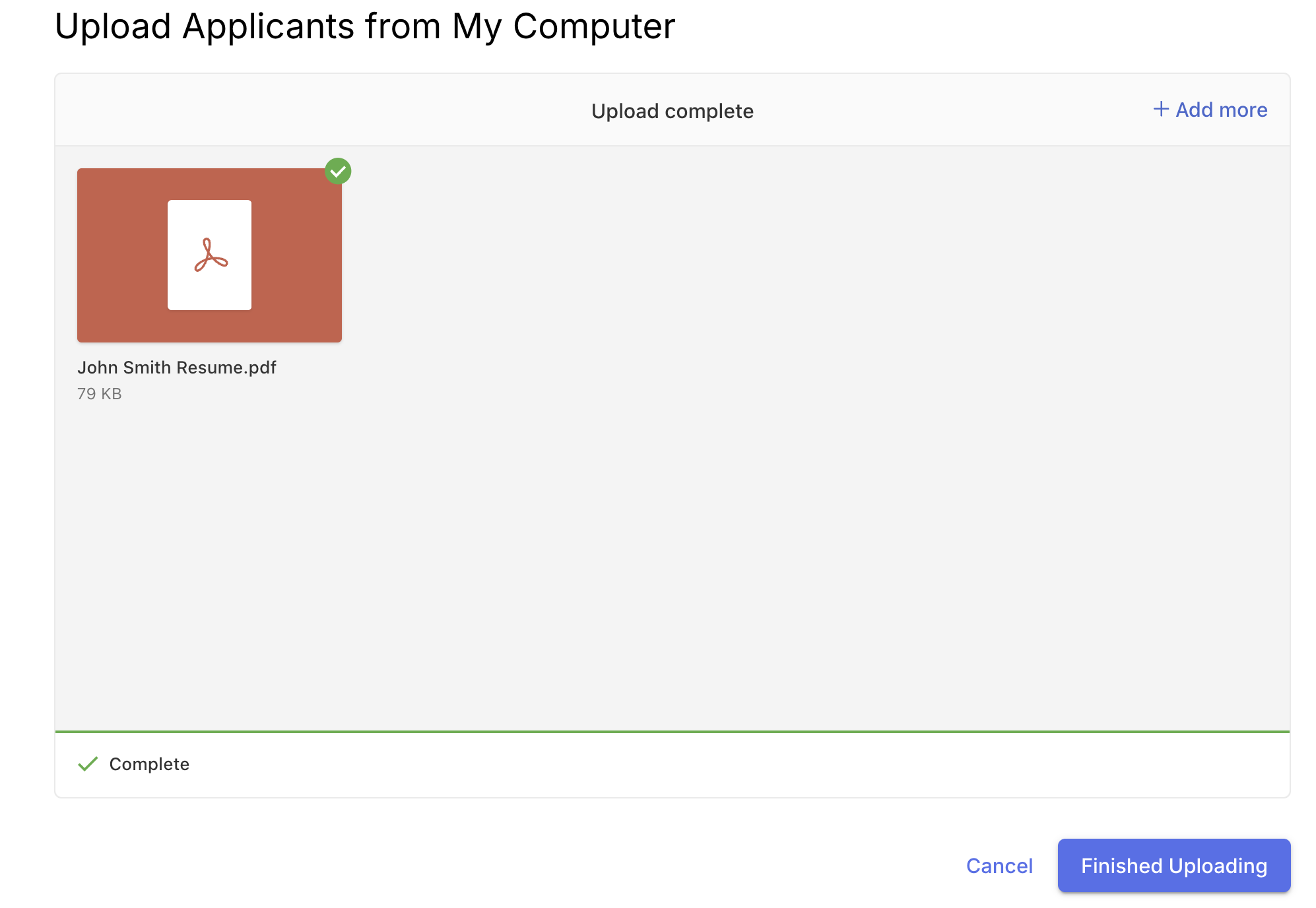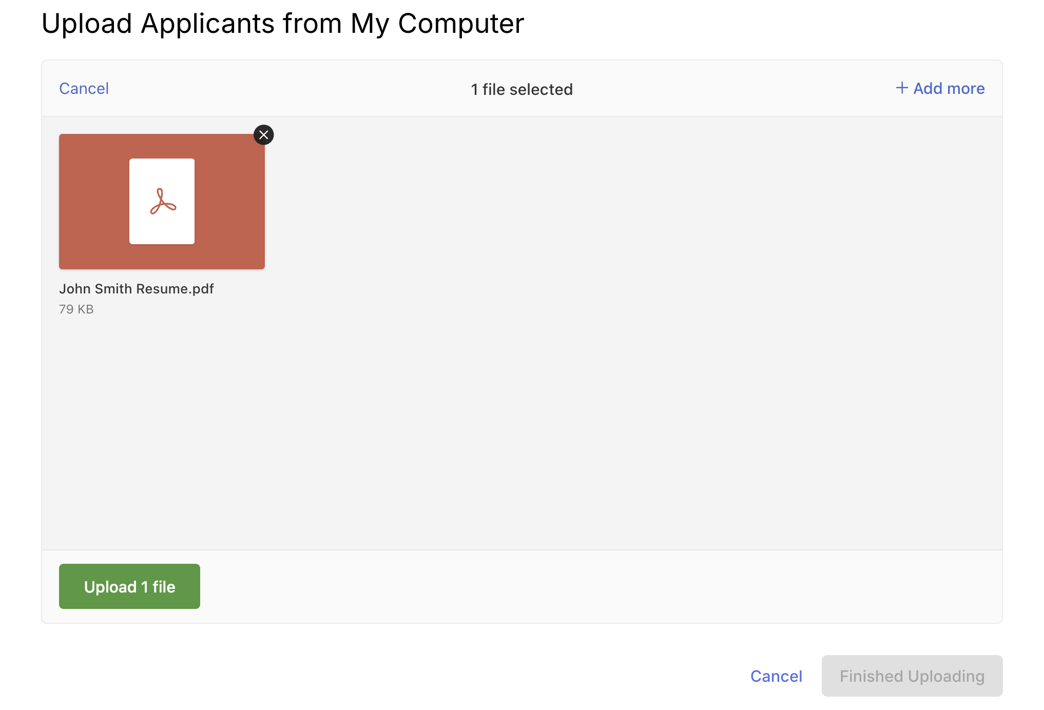 When you drag the resume into the system, you can add more in the top right by clicking + Add More. When you're ready, click Upload File