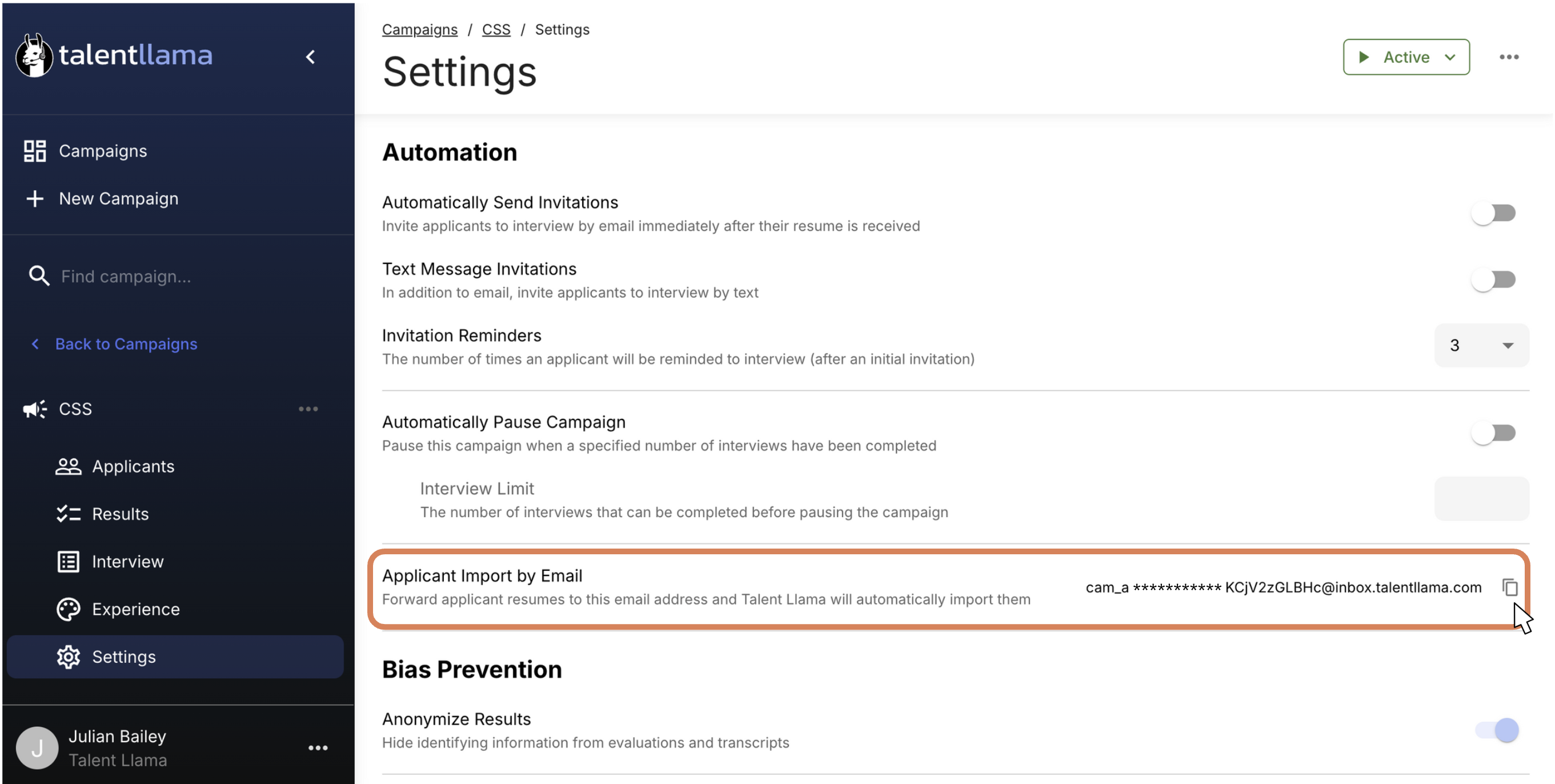 Head into your Campaign, then click Settings, then copy the Applicant Import by Email address. Remember, the email address is unique for each Campaign.