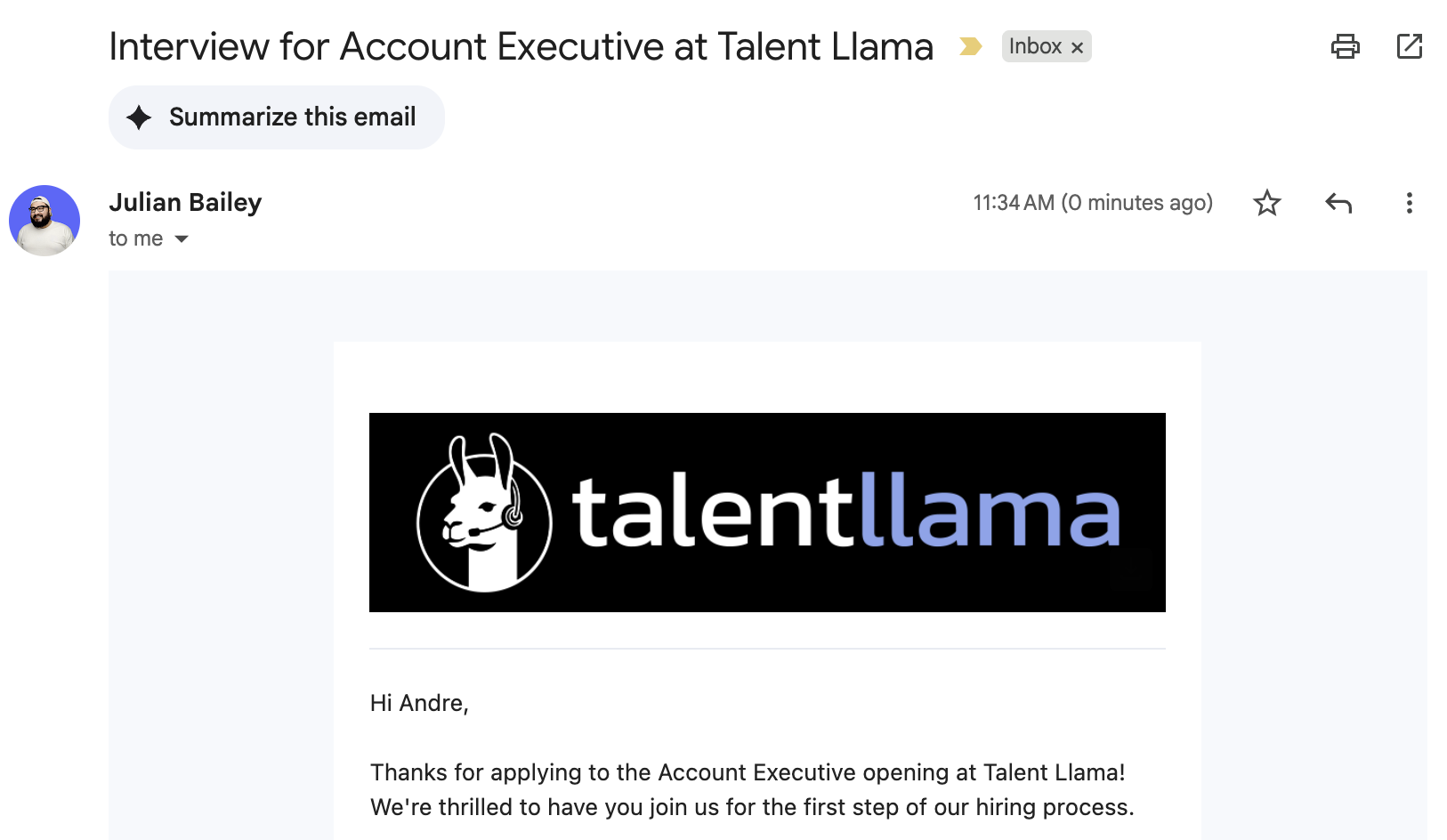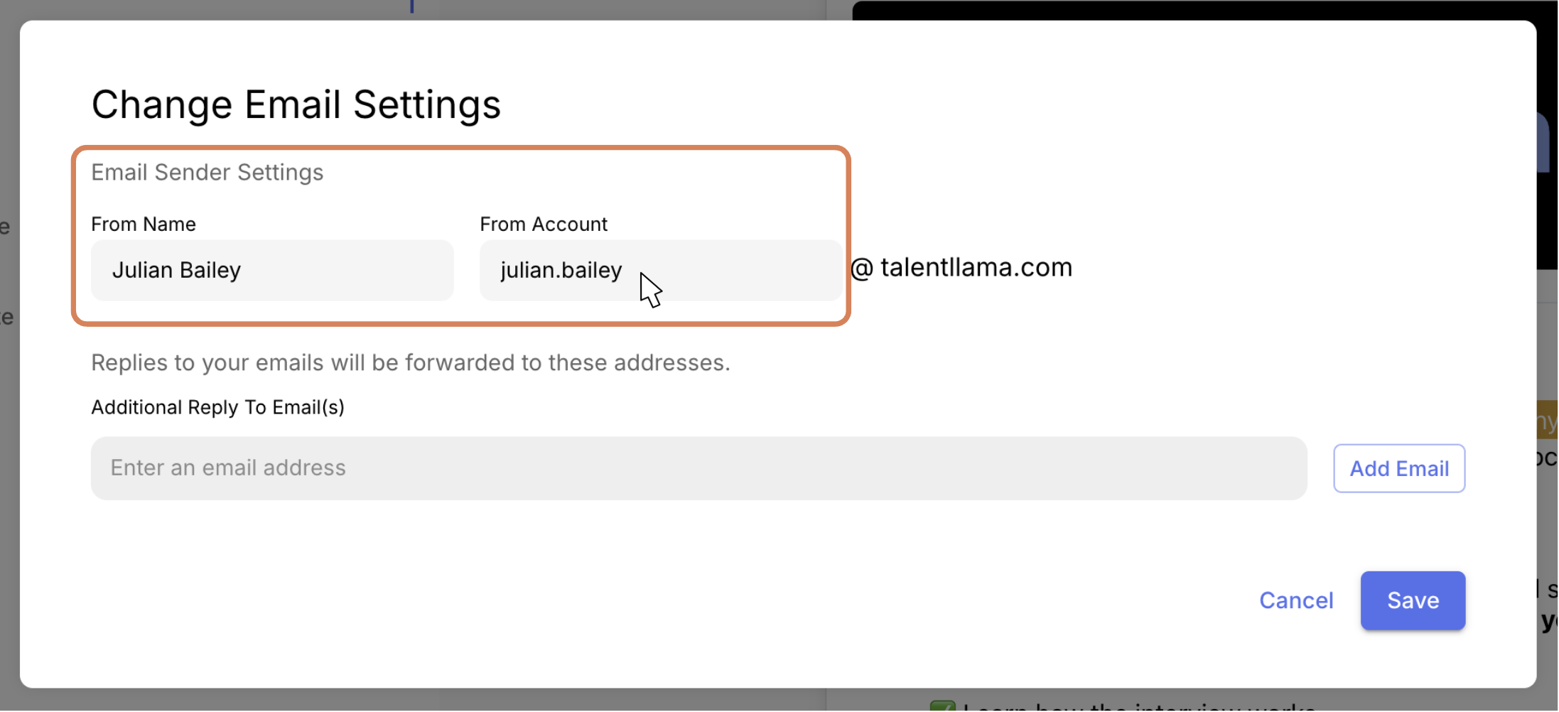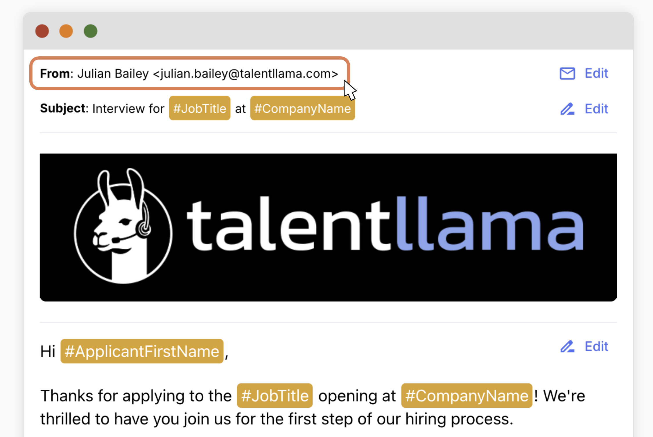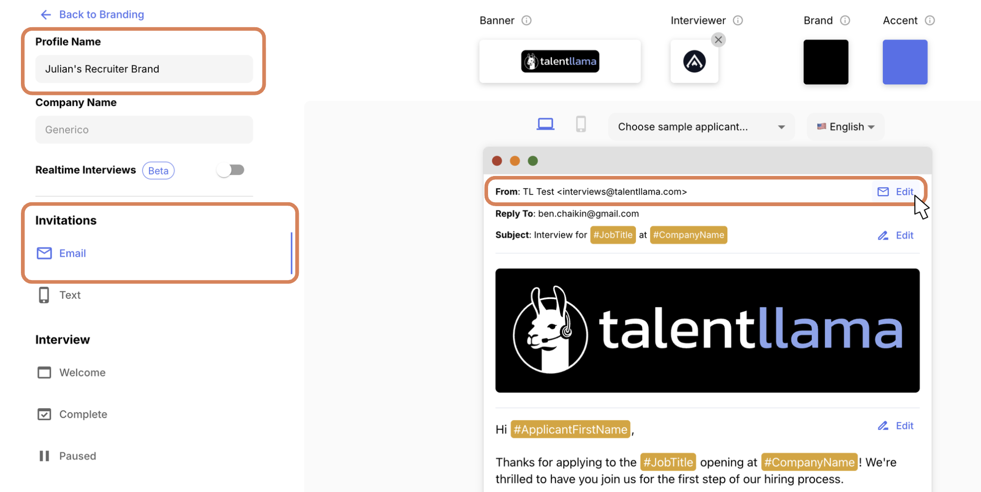 By default, all invites are sent from hiring@talentllama.com. That’s not ideal, because it looks generic, can lower trust, and is more likely to be ignored or missed. We strongly recommend setting up a Custom Domain so emails come from an address you control (for example, @yourcompany.com). This makes invites look legitimate, consistent with your brand, and more familiar to candidates.