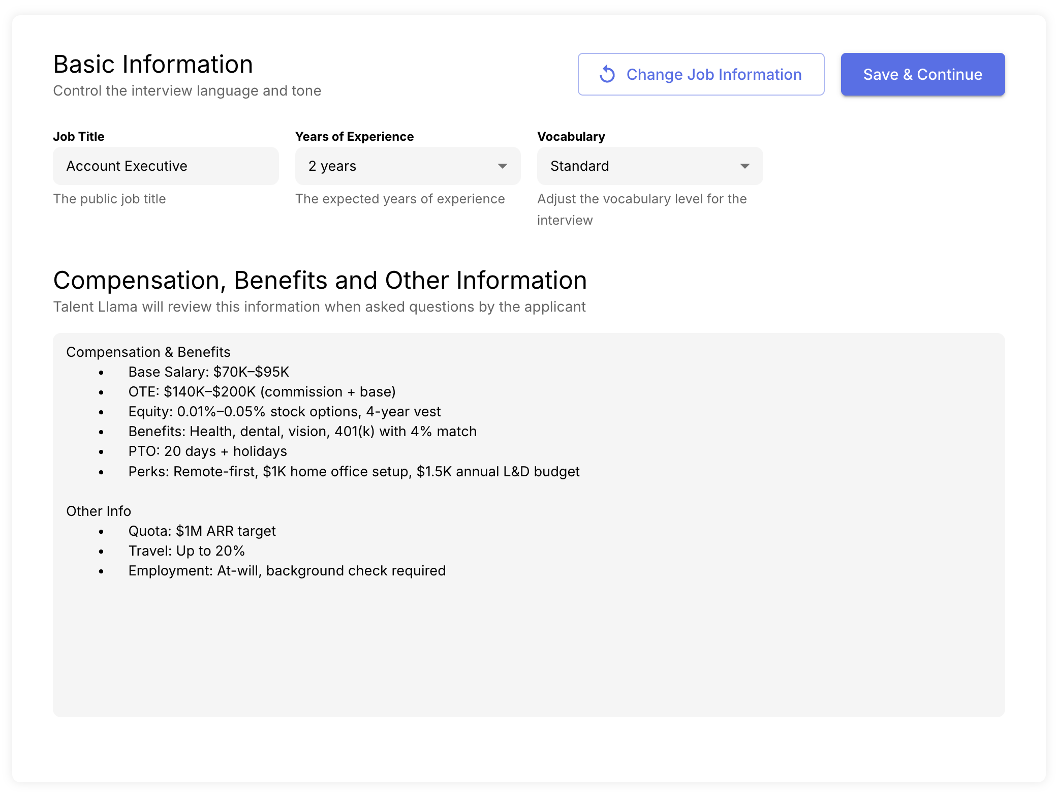 Years of Experience will assist in the creation of interview Topics; and Vocabulary will adjust how the AI speaks to the candidate.