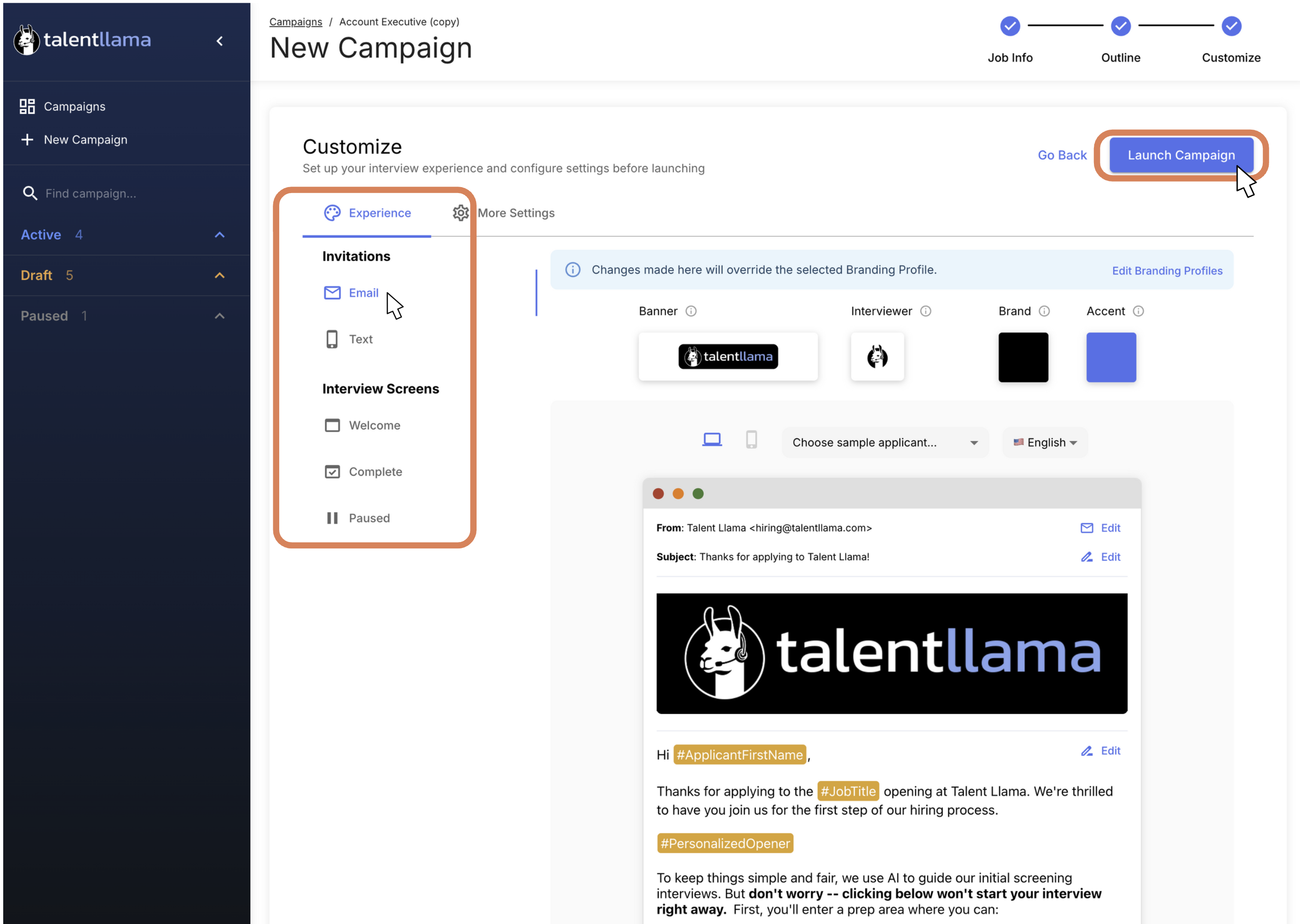 Talent Llama makes it easy to build a Campaign that fairly screens your applicants and moves them efficiently through the funnel, surfacing top candidates for second-round interviews in record time.