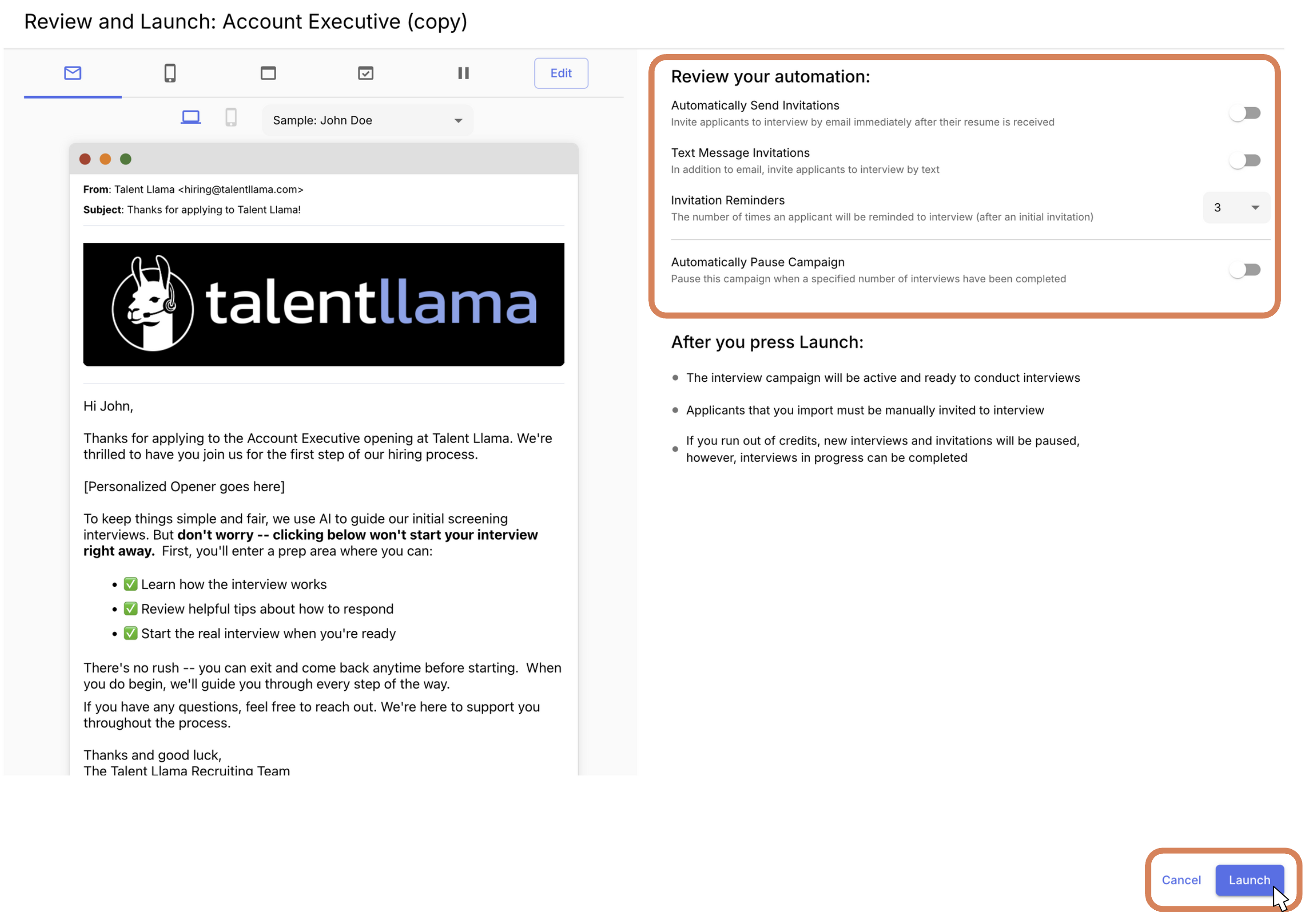 If you're ready to automate sending, turn on the Automatically Send Invitations toggle and click Launch. Any applicants already in the stage you selected during the setup from your ATS will launch immediately, and you can manually add applicants at any time too!