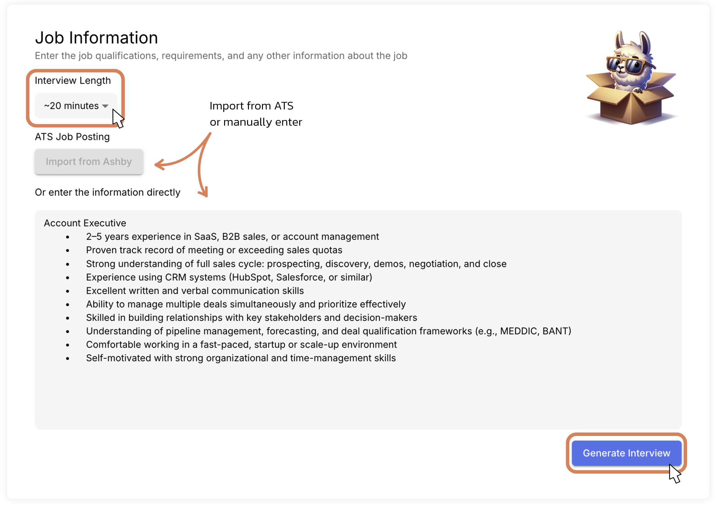 Step 2: Select your Interview Length. This sets the approximate duration of the interview and generates enough Topics to fill that timeframe.