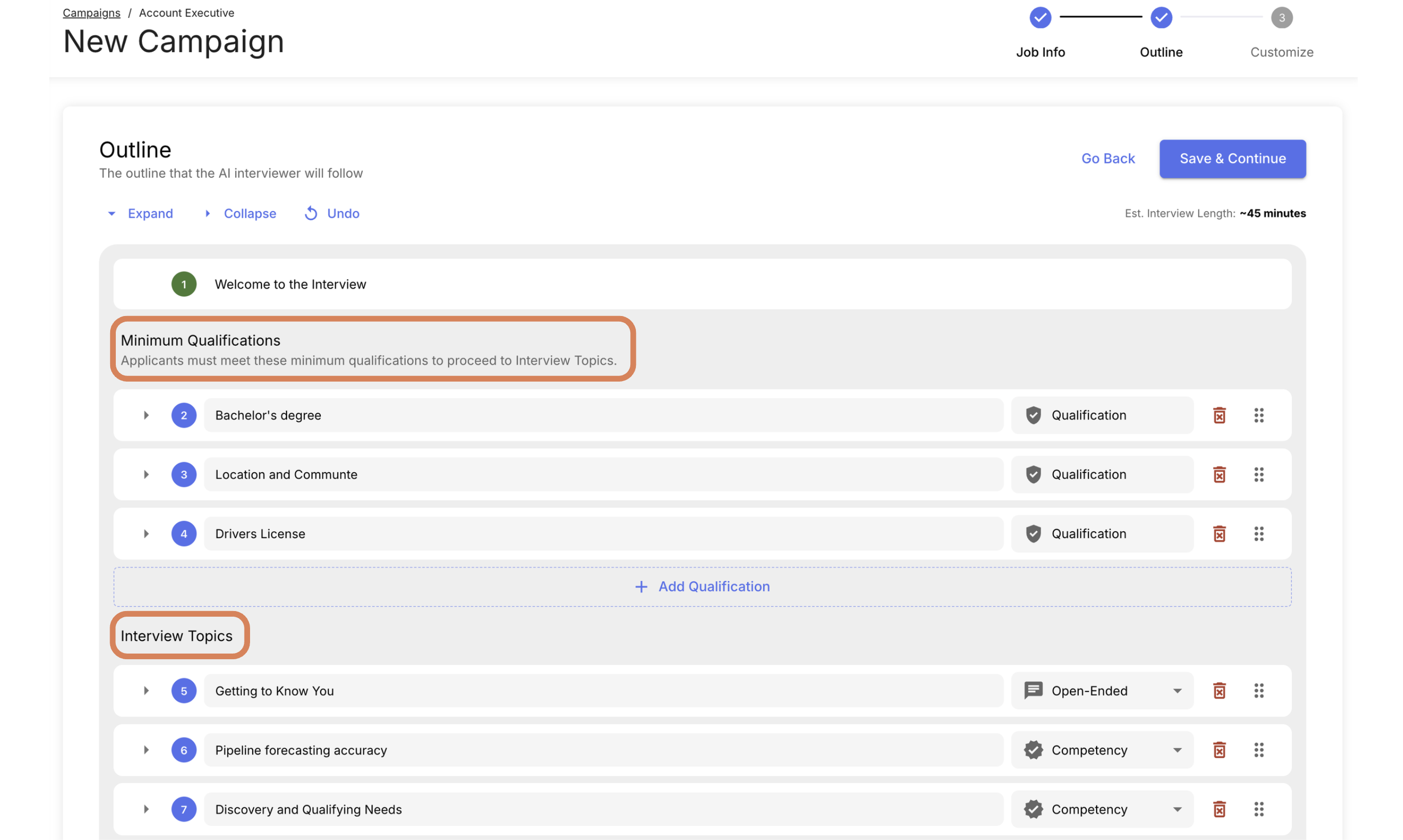 Tip: Best Practice is to create a new Campaign for each job posting, however, you can easily Clone Campaigns to make this set up faster each time. Remember, once a Campaign is live and interviews are running, you can't edit the Outline or change any of the Topics. (See Versioning).