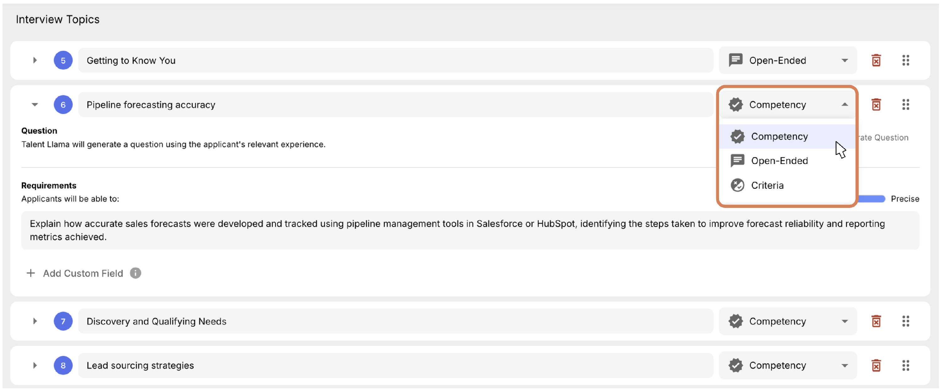 There are multiple types of Topics you can set. Competency, Open Ended, and Criteria are the choices here (ask about the Typing Test Topic!). We have an in-depth help article here breaking Topics down, to ensure you use the best type for your interviews.